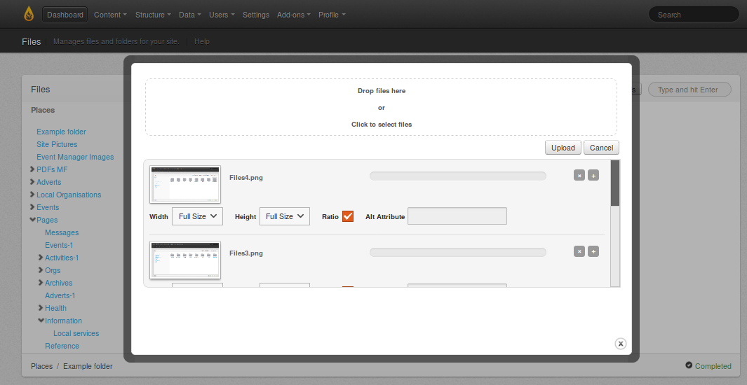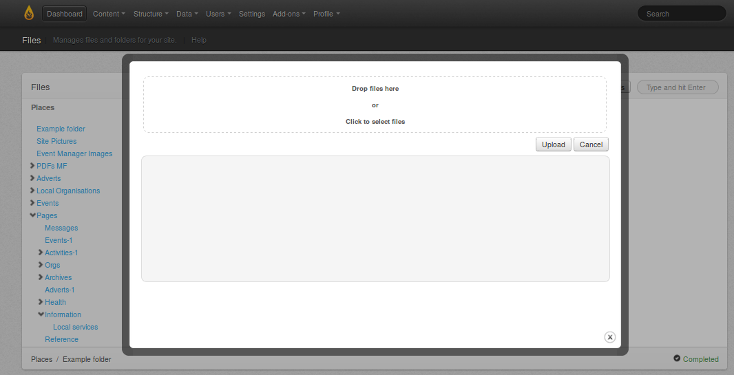 Next, click the Upload button. A window appears with a panel at the top which asks you to either "Drag files here OR Click to select files". Usually, you would click in that area and then navigate your hard drive and choose one or more files from a folder.