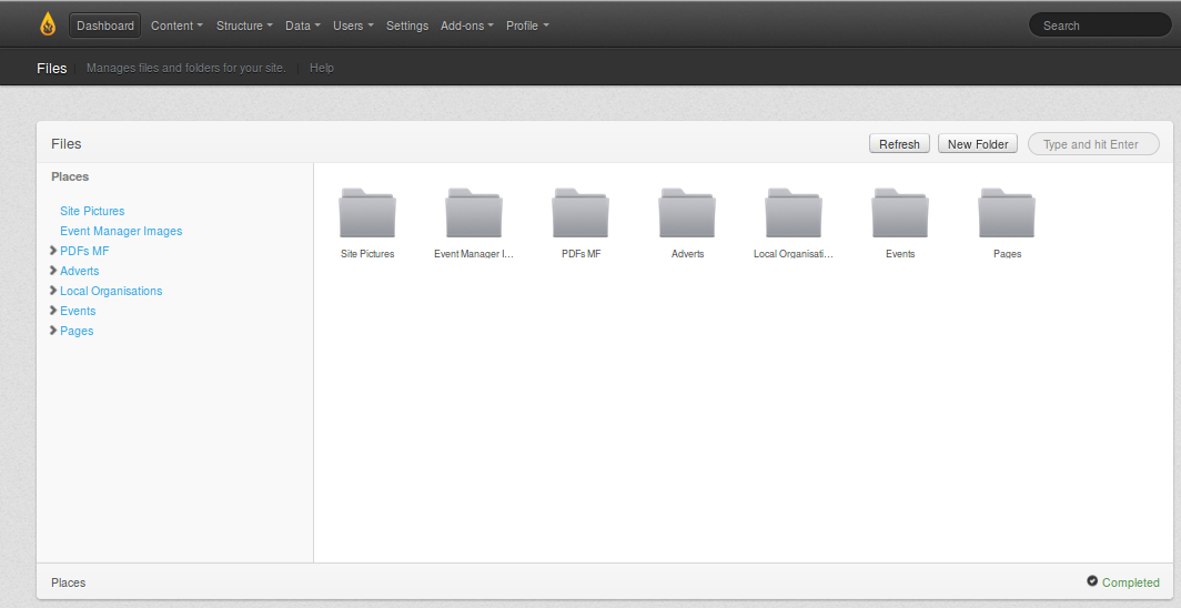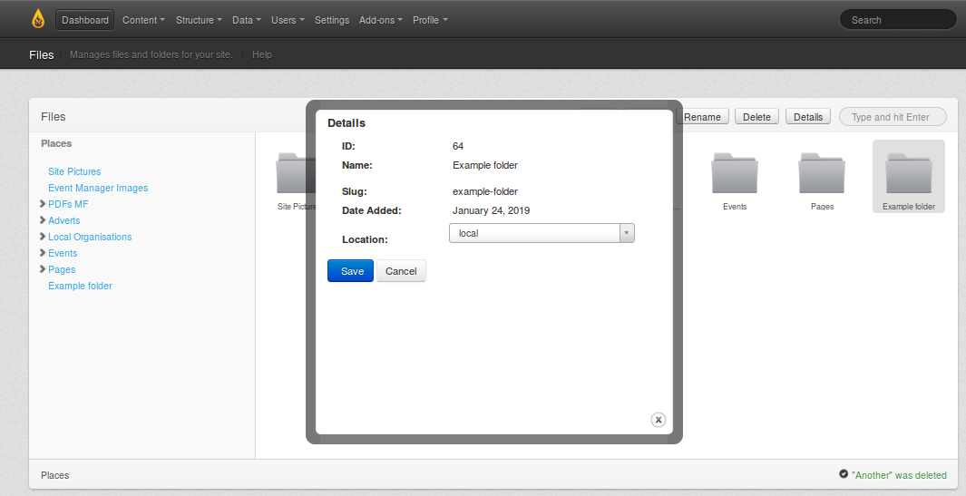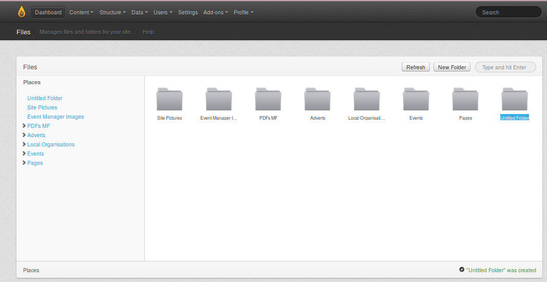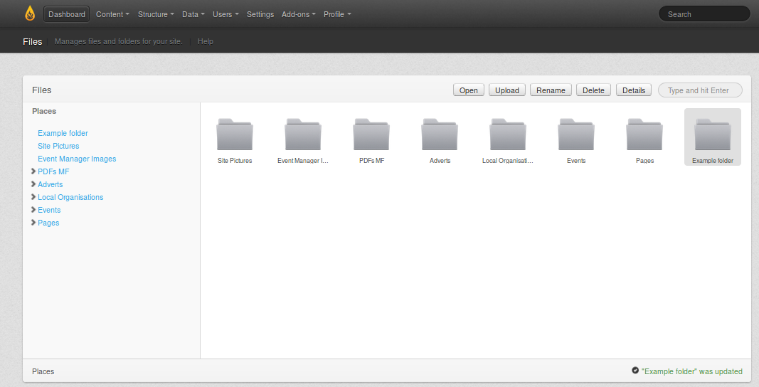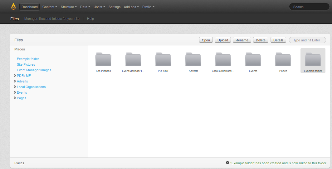 After typing the name "Example folder" you then see the name in the normal grey text, plus a confirmation message in the lower right that it has been renamed.