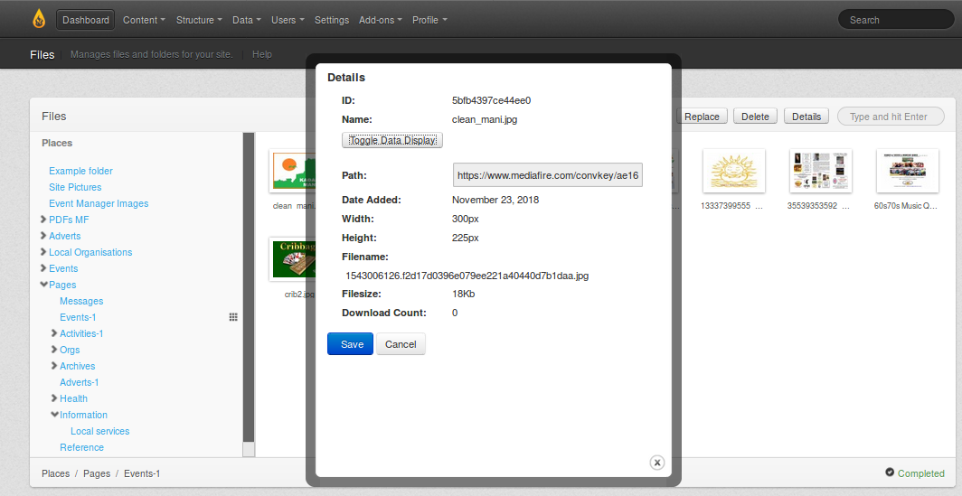 Uploading images to the PsM server consumes the storage available in the domain hosting. That storage is limited to a quite small number of Mbytes and is used for the web pages files, database files and the images etc. Extra storage can of course be purchased for an annual fee. Cloud storage with other services such as Amazon, Rackspace, Google can also be used, but these make charges for storage and usage of the data. A free (in 2018 and 2019) service that provides suitable storage is Mediafire. PyroCMS has been extended to utilise this service for any images to be uploaded.