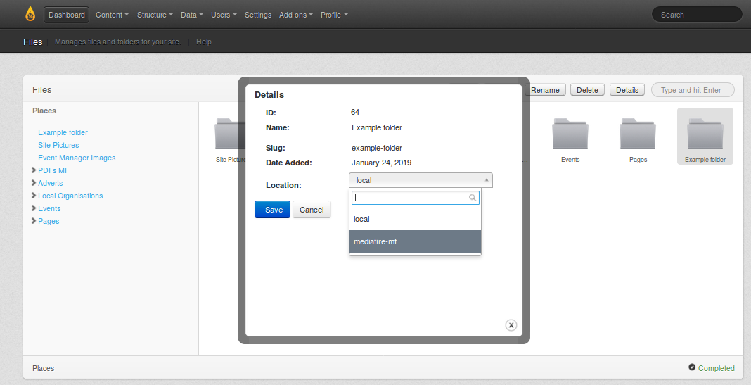 If you want/need to relocate this new folder to MediaFire you now click the "Details" button. You will see a dialogue box appear that shows the Location as "local". Drop down the selection and select "mf-mediafire", then click Save. At the lower left of the area you will see a confirmation message that the folder has been created at MediaFire storage servers.